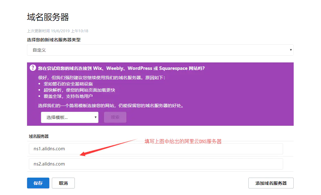 4.默认使用GoDaddy提供的域名解析服务器,我们也可以改为阿里云域名解析服务器,为了提高解析速度和使用稳定